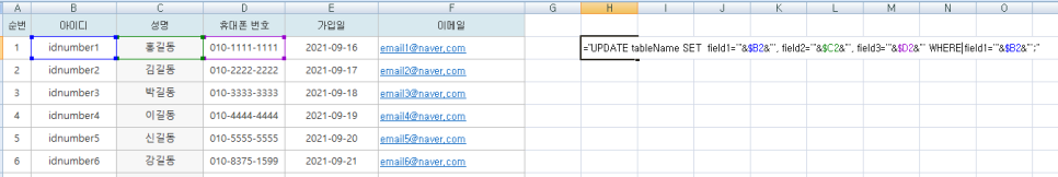 예를 들어서 많은 회원의 정보를 엑셀자료로 넘겨받았을 때, 테이블에 업데이트 시키거나 인서트 시킬시 사용 사용방법 예) ="UPDATE tableName SET field1='"&$B2&"', field2='"&$C2&"', field3='"&$D2&"' WHERE field1='"&$B2&"';" 이런식으로 한 셀에 쿼리 입력 후 아래로 쭉 드래그 하면 회원 하나하나의 쿼리문이 만들어진다. 사용예시 내가 사용했던 예시는 새로운 사용자는 INSERT / 이미 있는 사용자는 바뀐 정보가 있을 수 있으니 UPDATE 조건은 예를들어 아이디나, 회원 코드 같은 것으로 구분한다. (위와 같은 업데이트 문으로 이미 있는 사용자는 정보를 업데이트를 시켜준 후, 인서트로 새로운 사용자를 추가해주나, 이미 있는 사..